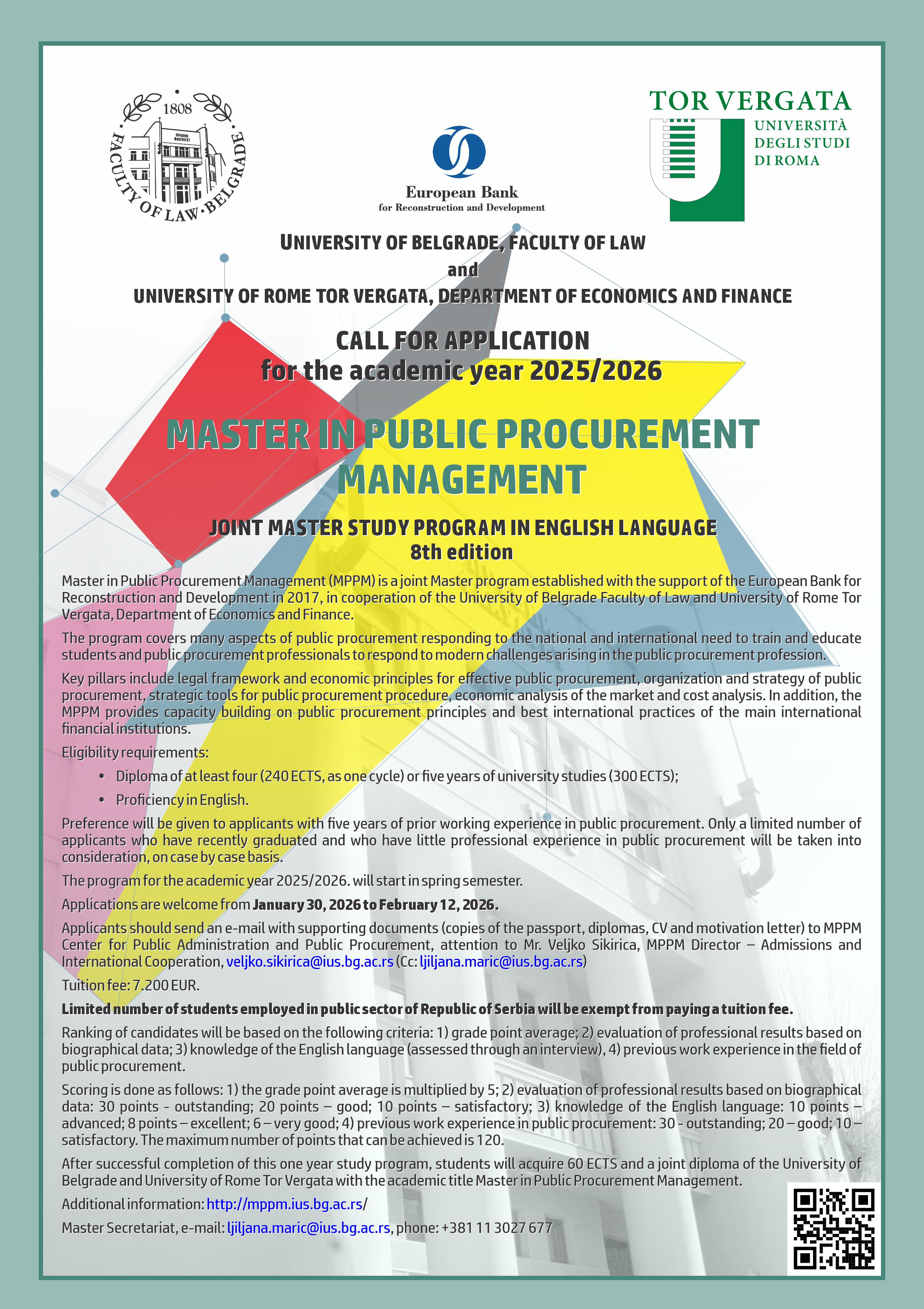 Master in Public Procurement Management (MPPM) is a joint Master program established with the support of the European Bank for Reconstruction and Development in 2017, in cooperation of the University of Belgrade Faculty of Law and University of Rome Tor Vergata, Department of Economics and Finance.